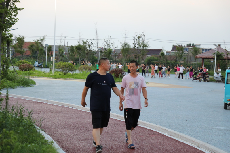 广场舞台上的惬意。每天傍晚6:30分,文化广场都会传出一阵阵欢快的音乐声,伴随着音乐的节奏,近百人舞动的身姿吸引着不少人跟着跳动比划。自文化广场建成后,农场公司特地在百姓大舞台广场安装了接电装置,为职工居民跳广场舞提供方便,舞台南侧的高杆灯光明亮,舞者们的脸上洋溢着幸福的微笑。广场建成后,退休职工黄淑英主动当起了广场舞的老师,每天领着大家一起跳操跳舞健身,一支百余人的广场舞队每天活跃在文化广场,带动了更多的职工居民加入到跳舞健身的行列。黄淑英说:每晚跳舞健身后的大汗淋漓舒服极了,不仅使全身都得到了活动和放松,增强了体质,还增进了大家之间的感情。