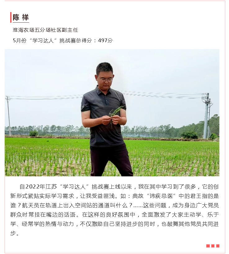 为推动党史学习教育常态化长效化,进一步建好用好“学习强国”学习平台,射阳县根据省、市、县的统一部署,5月中旬以来,全县3.5万余名“学习强国”学员积极参与“喜迎二十大奋进新征程”——2022江苏“学习达人”挑战赛,一大批“学习达人”脱颖而出,形成了以赛促学、比学赶超的生动局面。