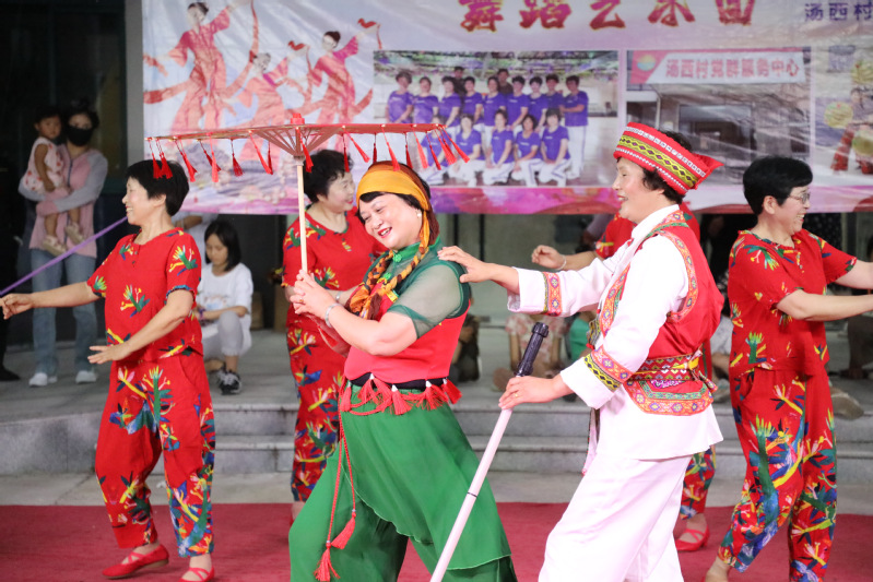 演出中,《舞动中国》《军港之夜》《绣红旗》等舞蹈,仿佛每一个舞姿都充满了浓浓的爱国情,持续感染着在座的观众,引起阵阵掌声;《十送红军》《唱支山歌给党听》《我和我的祖国》等歌曲,饱含深情而又铿锵嘹亮,让众人心潮澎湃,充满力量与干劲;《新龙船调》《我在茶乡等你》《你从草原来》等情景剧,民族风情浓郁,展现了56个民族一家亲;《不忘阶级苦》《有钱没钱都是妈》等话剧和小品,将爱国和孝亲教育展现得淋漓尽致,深度引发职工居民的共鸣,将“村晚”推向一个又一个高潮......“ 感人心者,莫先乎情,莫始乎言,莫切乎声,莫深乎义。”短暂的下雨,并没有打消演出者和观众们“双向奔赴”的热情,载歌载舞的人用心用情用力,或站或坐的人,也纷纷用掌声和欢呼声表示反响和回应。