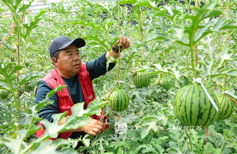 4月17日,连云港云台农场云水湾设施大棚内,工作人员正在管护吊蔓生长的“小糖丸”西瓜。该品种颜值高、口感好,吊蔓种植提高了密度与产值,预计4月下旬至5月上旬上市。朱倩 摄 视觉江苏网供图