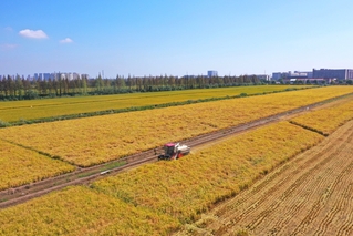 10月9日,临海农场的稻田里机声轰鸣,1000亩早熟水稻品种“武育粳702”首块田正式开镰收割。