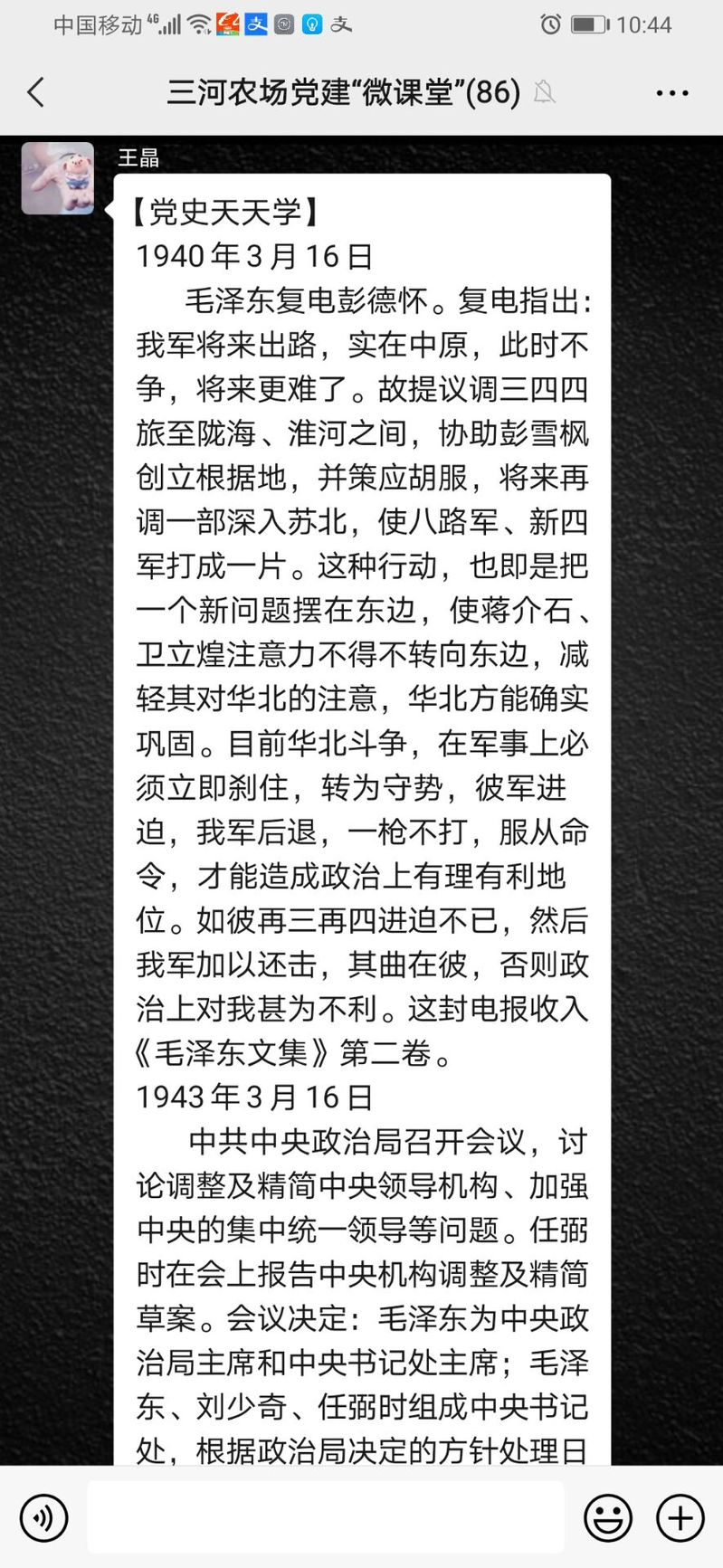 在全党开展党史教育之际,三河农场公司在利用橱窗、LED大屏、党建群、微信、美篇等学习的基础,于3月16日利用党建微课堂平台开设“党史天天学”专栏,每日在群内推送党史故事,党史知识,党史上的今天等内容,引导党员通过学习党史来汲取智慧和力量,滋养初心和使命。