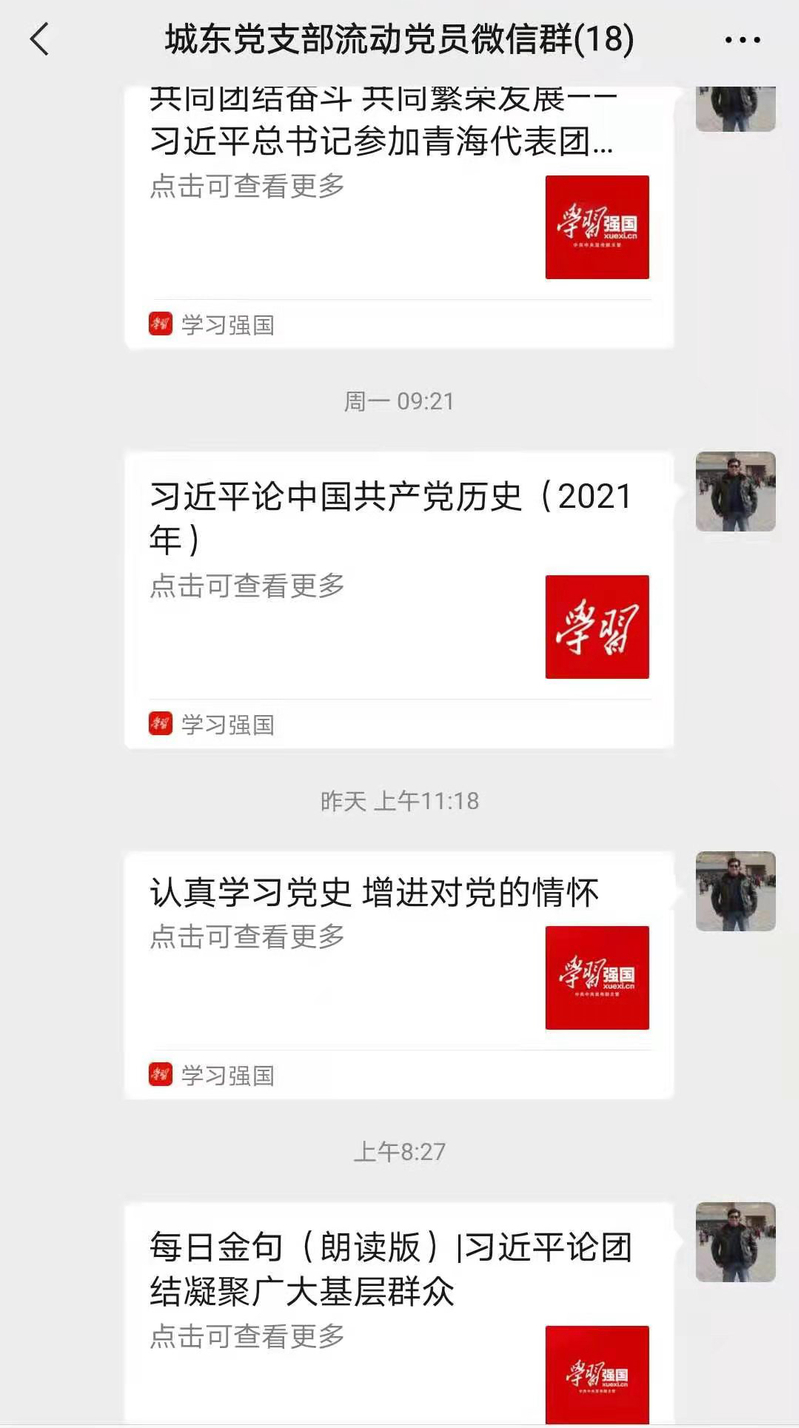 “我作为党支部书记,作为党史学习教育的第一责任人,每天都将学习内容发送至流动党员微信群,对流动党员的学习需求和方向进行及时跟踪,确保流动党员不流失,一个不掉队……”城东党支部书记邱金龙介绍。