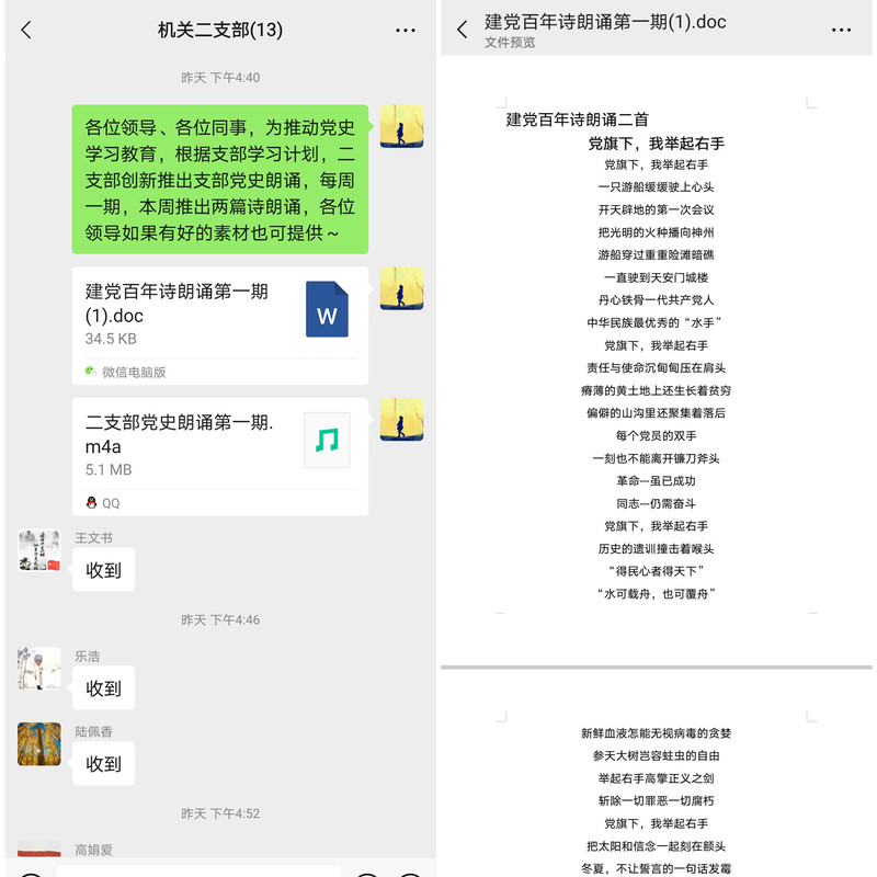 该支部党史朗诵“送学音频”每周推出一期,内容包括党史小故事、党史诗朗诵、党的历史及重要思想传递等,旨在让支部内的青年血液通过朗读形式进一步学起来、动起来,进而引导支部党员学史明理、学史增信、学史崇德、学史力行,始终牢记党的宗旨,严守党的纪律,确保学习全覆盖,学习内容真正走神走实、入脑入心。