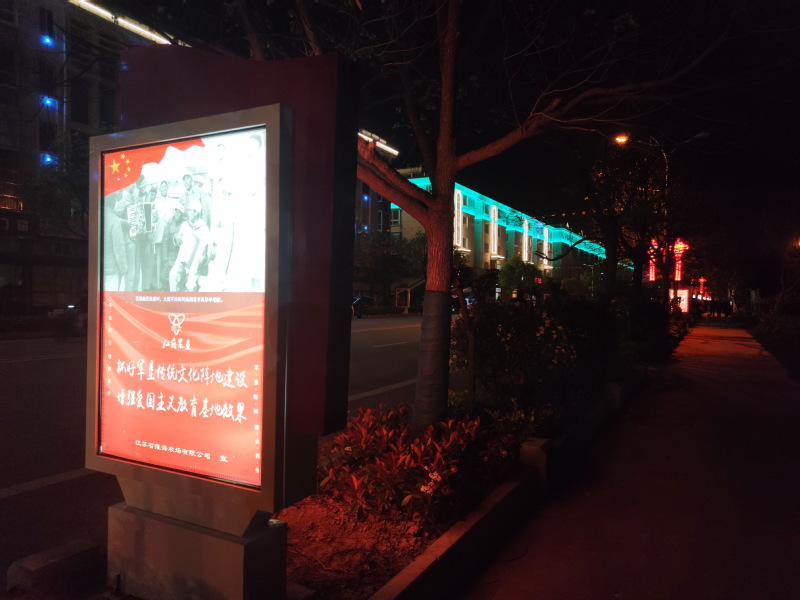 在全国人民热烈庆祝中国共产党成立100周年这一时刻,为配合做好中国共产党成立100周年主题宣传和庆祝活动,淮海农场有限公司以省市文明单位的创建为抓手,经过精心筹备、紧张施工,5月7日傍晚,淮海路两侧的路边绿化灯箱广告宣传栏正式安装完成并通电使用。当天晚上,那种红彤彤的主题宣传色彩,照亮了一公里长的淮海路,也让淮海路上又增添了一道新的以党的百年诞辰为主题宣传的风景线。