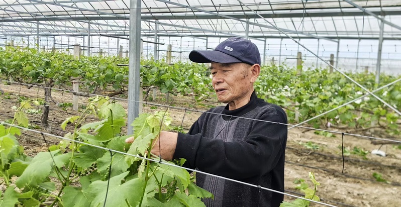 春日管护正当时,海安农场工人在温室大棚内精心打理葡萄藤,助力丰产增收。
