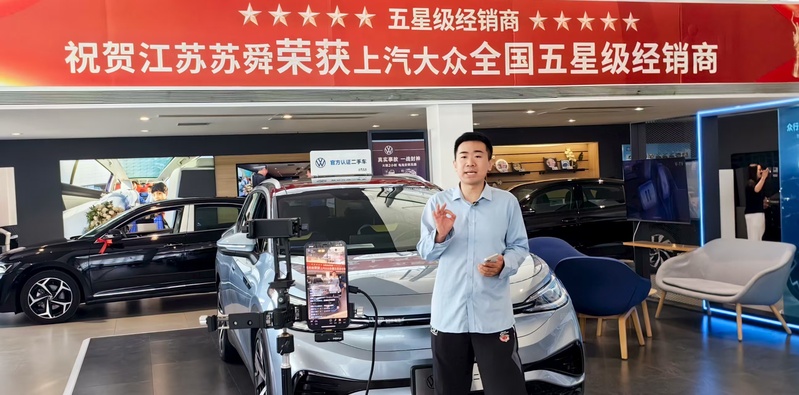 苏舜公司创新“直播+服务”销售模式,重点发力“抖音、小红书”等平台,加大直播场次与粉丝互动,将留资转化率提升至12%,平均观看时长达到23分钟。图为工作人员在直播间提供二手车在线置换评估、金融方案计算等服务。