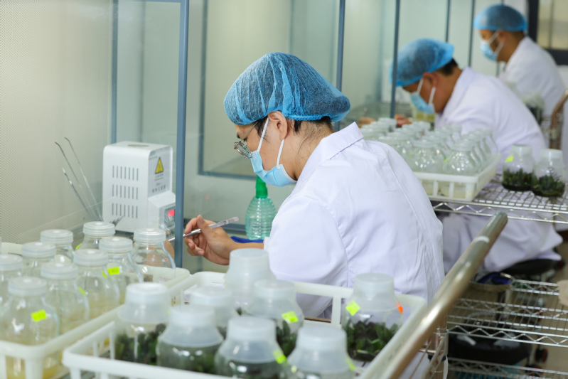 云台农场攻克了蝴蝶兰花苗培育中的技术瓶颈,运用科技手段实现了蝴蝶兰花苗的智能化流水线生产。图为技术人员正“全副武装”在洁净的操作间里忙碌,精心制作培养基。