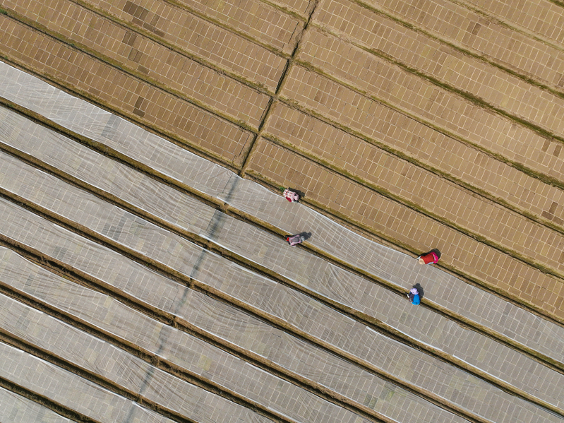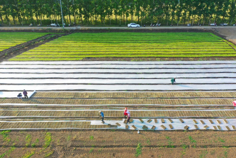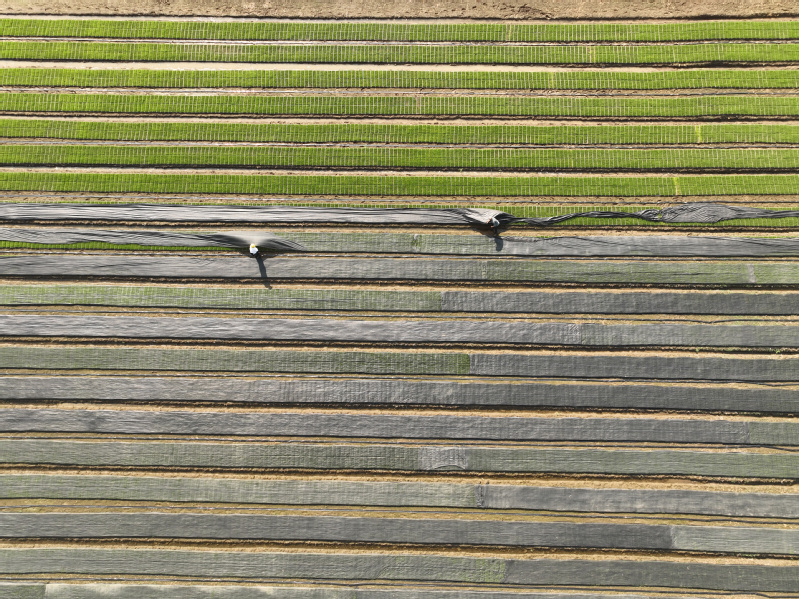 在苏垦农发岗埠分公司田头,职工们正在把经“暗化”后的秧盘移到大田里,采用微喷灌技术进行集中育秧,加强精准水肥调控、集中标准化育秧管理,为即将开展的机插秧作业夯实基础。
