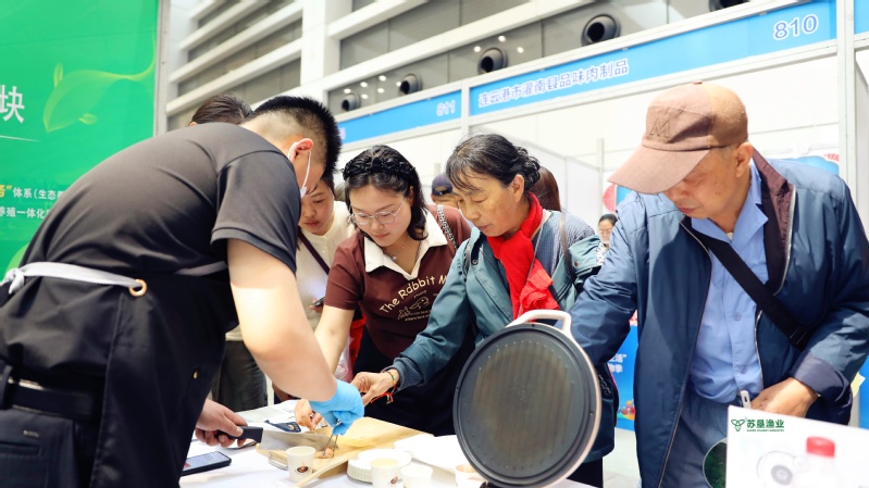在刚刚结束的2025“苏新消费·夏夜生活”暨连云港第六届网络购物节上,苏垦渔业的鲜虾饼、金沙虾球、虾滑等对虾系列产品开售两小时便被抢购一空。图为顾客现场品尝对下系列产品。