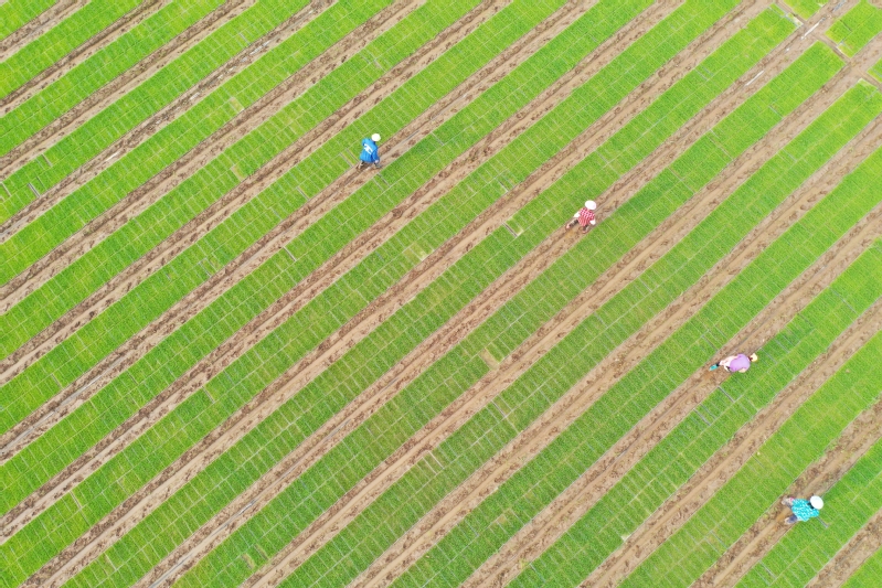 5月29日,苏垦农发江心沙分公司工人在田间忙着揭膜炼苗、躬身巡苗、定点查苗,为肥水管理和病虫害防治提供参考,确保育出适龄壮秧,按时移栽。