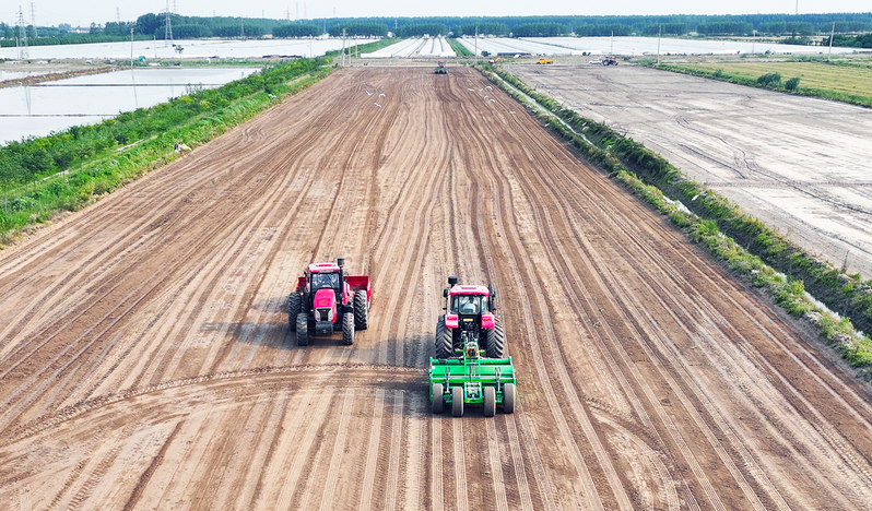 5月25日,苏垦农发弶港分公司第二生产区8连田间,北斗卫星导航铲运机、激光平整机等25台套大型机械来回穿梭,全力推进土地平整进度。