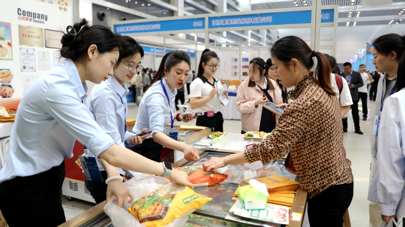 日前,“苏新消费・夏夜生活”暨第六届连云港网络购物季盛大开幕。东辛农场的“简苏”牛奶与“东米”鸡产品携手亮相,组成“健康CP”,在展会上大放异彩,引发消费热潮。图为顾客在“东米”展位前采购鸡产品。